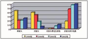 圖1 所示從1999年到2002年(2002年的數(shù)據(jù)是由上半年數(shù)據(jù)推算而來)單探頭、雙探頭、雙探頭帶定位系統(tǒng)和多探頭符合線路,四種不同核醫(yī)學(xué)設(shè)備每年各種類型所占比例?梢钥闯。最為明顯的是普通雙探頭在2002年僅僅占總數(shù)的5%,普通單探頭占總數(shù)25%,多探頭帶符合電路系統(tǒng)占總數(shù)59%。普通雙探頭帶X線定位系統(tǒng)占總數(shù)10%?梢钥闯鰡翁筋^SPECT和多探頭符合電路系統(tǒng)呈增長趨勢,尤其以多探頭符合電路系統(tǒng)更為明顯。
